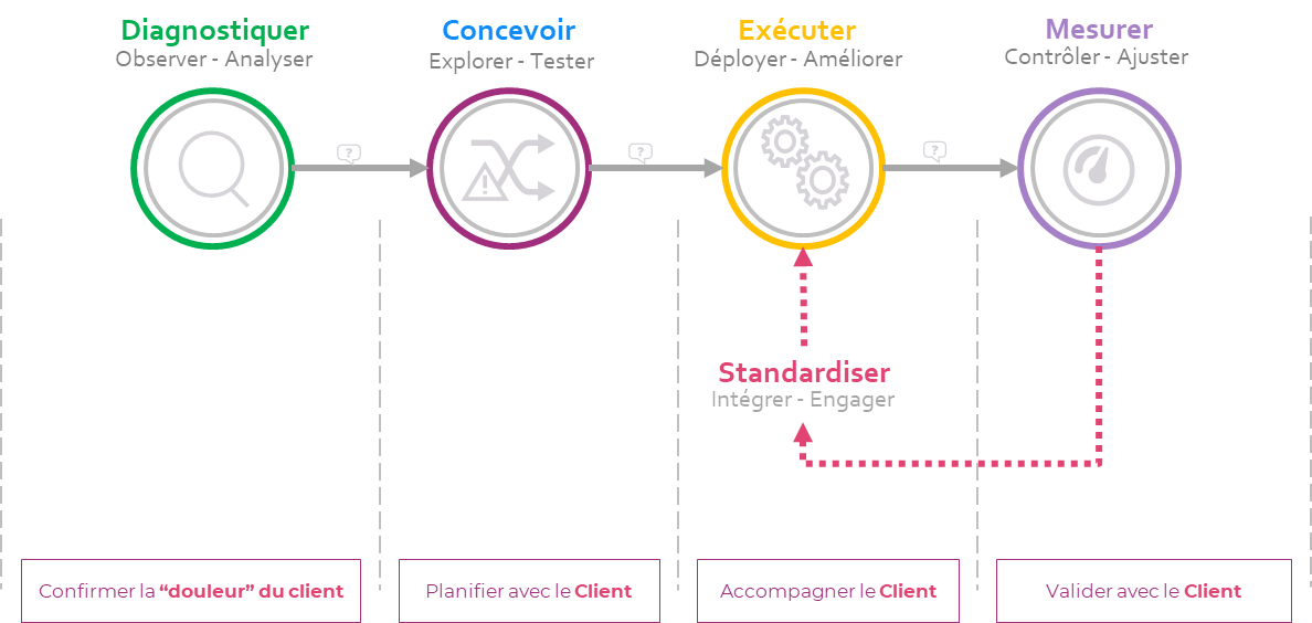 Nos outils et méthodologies d’amélioration continue nous permettent d’analyser, d’éliminer les problèmes liés à l’inefficience et à l’inefficacité de vos processus, pour mieux répondre aux besoins de vos clients et consommateurs.